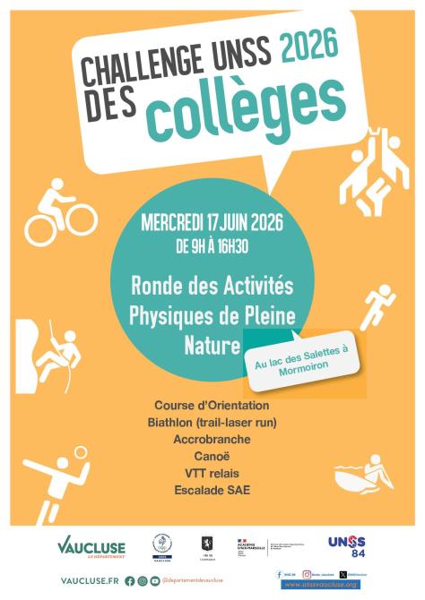 ’Union Nationale du Sport Scolaire de Vaucluse organise, en partenariat avec le Conseil Départemental de Vaucluse, le challenge UNSS des collèges 2026 pour la 23ème édition.