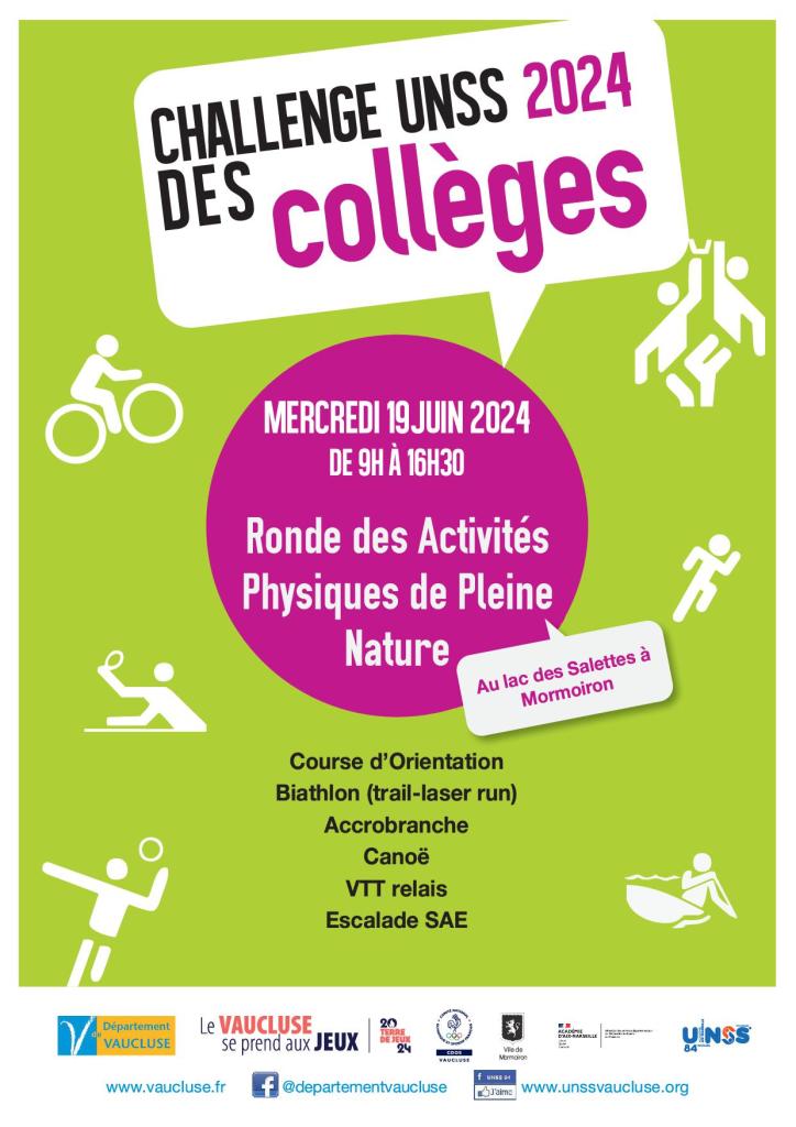’Union Nationale du Sport Scolaire de Vaucluse organise, en partenariat avec le Conseil Départemental de Vaucluse, le challenge UNSS des collèges 2024 pour la 21ème édition.
